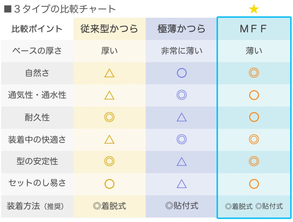 以下は従来型カツラ、極薄かつら、MFFを項目別に比較した図解チャートになります。